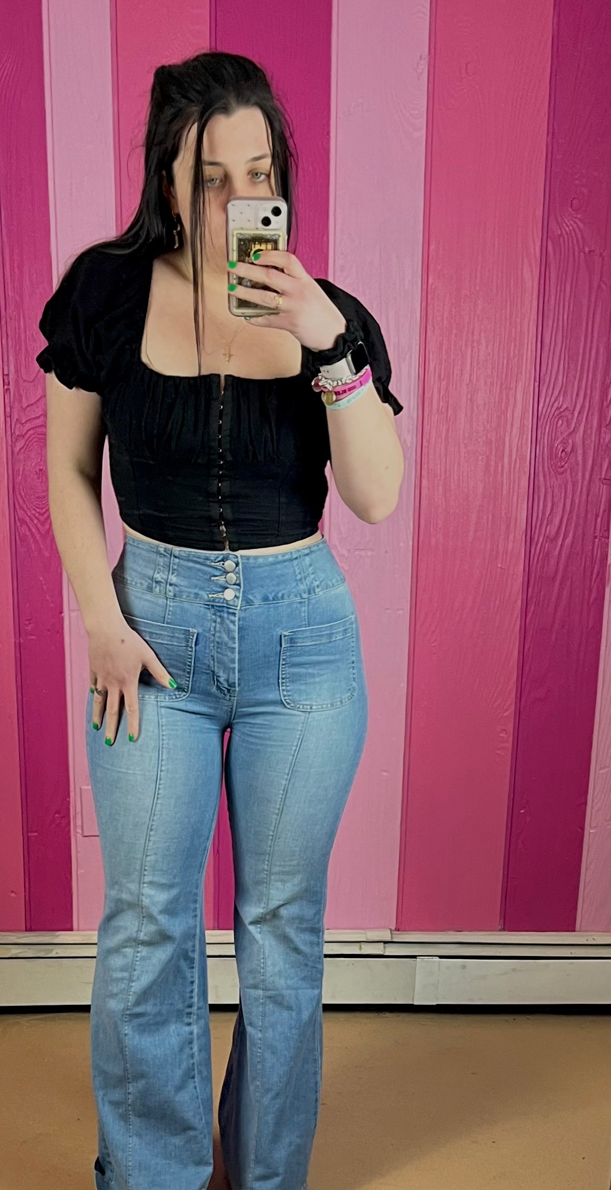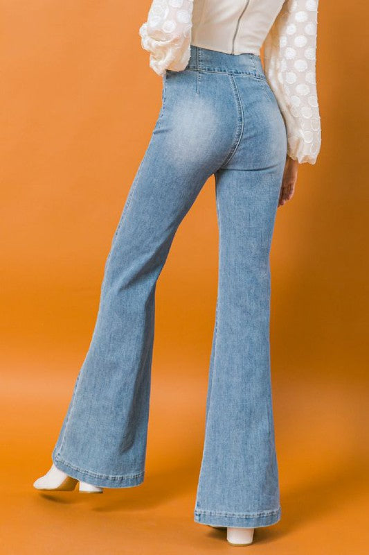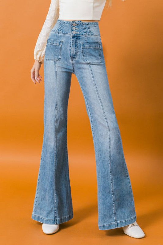 Get rodeo ready with a pair of Vicky Jeans! These light wash, flare jeans feature a high-waist along with three buttons at the waist which helps to perfectly cinch in your waist. With center seams on both the front and back to help elongate your legs, the Vicky jeans are the perfect jeans for a night out! They feature two front pockets let you store your stuff in style!